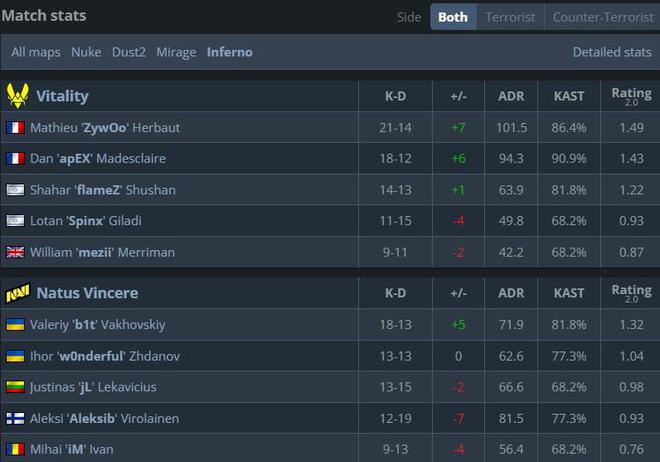 在关键的加时赛第4回合,法国CS魅力时刻★,apEX偷到背身拿下双杀,ZywOo紧接着上管完成1v2残局★,此后小蜜蜂再拿两分收下图一的胜利。