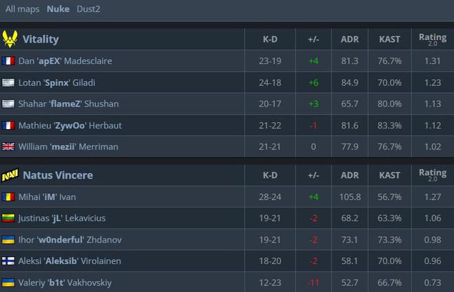 两队在核子分别打出出色的防守★,★“远古法国兵器★”apEX延续了半决赛的出色状态★,打出1★.31rating尽显责任★,以色列双星也提供了足够的火力支援,VIT五人击杀数均过20。