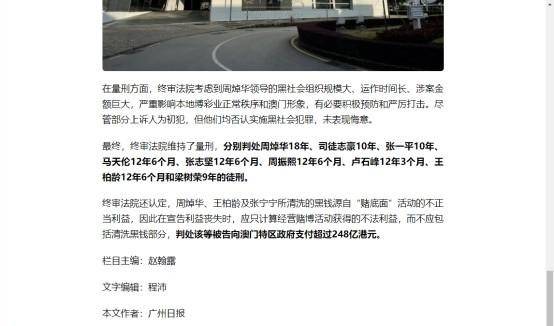 2022年5月,澳门检察院正式起诉周焯华和他的21个手下,罪名包括非法经营博彩、领导犯罪集团、巨额诈骗和洗钱。控方拿出了一堆证据◆■,资金流水记录显示他的非法交易高达8000亿港元,吓死人。庭审整整拖了好几个月,2023年1月18日,澳门初级法院判他162项罪名成立,18年监禁◆■★★◆■,还得赔86亿港元。